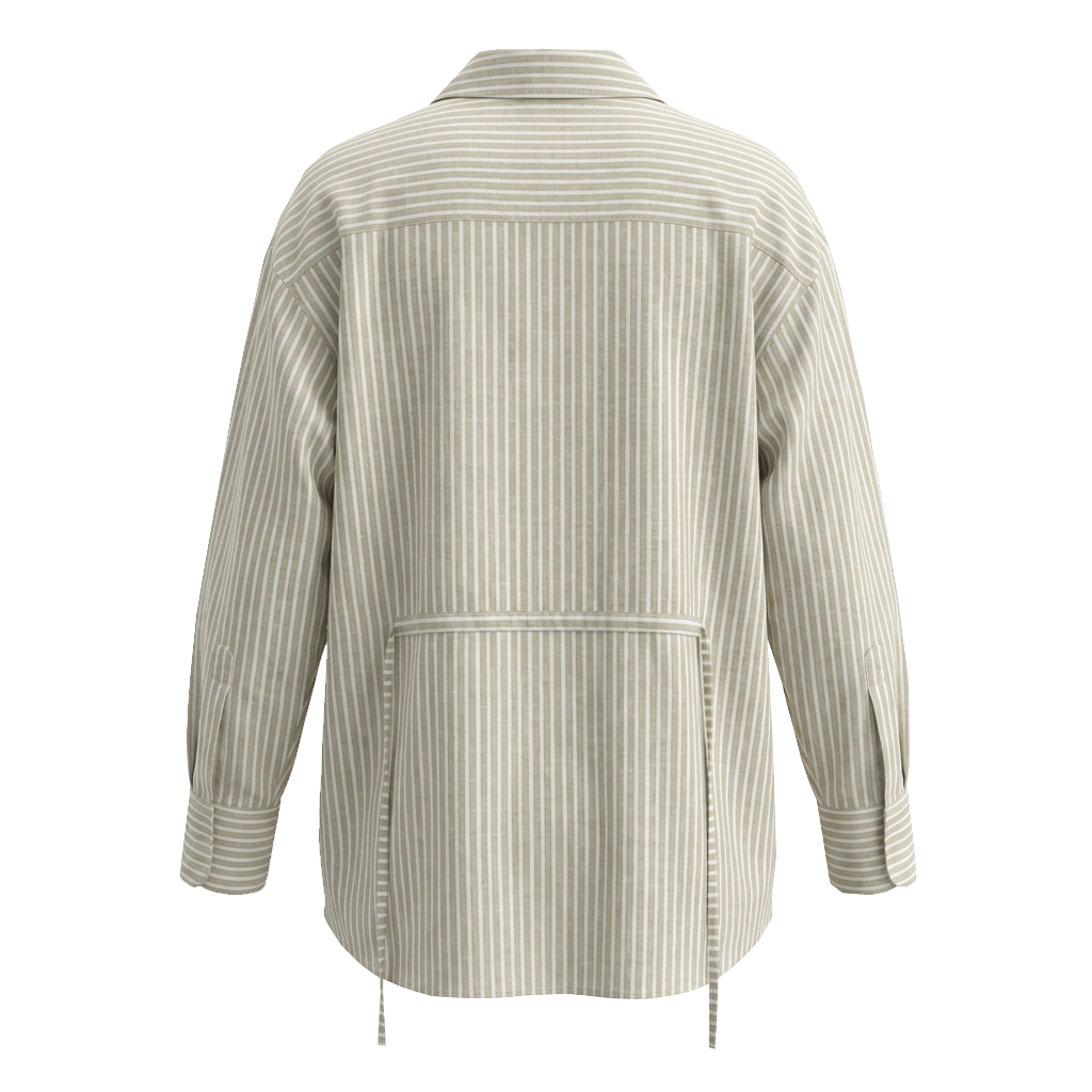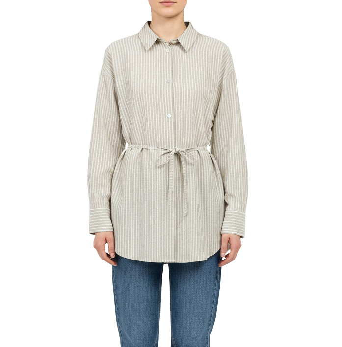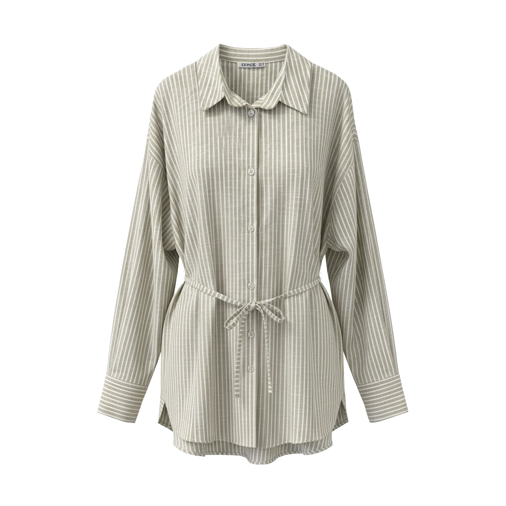 تونیک از جنس لینن ژاکارد راهراه با قد تا زیر باسن و کمربند نازک از جنس خود پارچه، انتخابی خنک و خوشفرم برای استایل روزمره و محیط کاری؛ با ایستایی مرتب و جلوهای شیک و کاربردی.