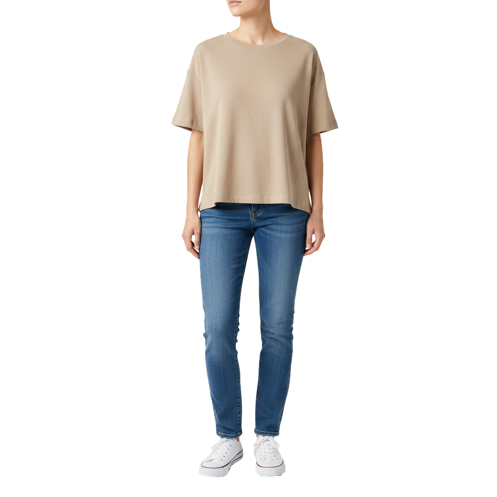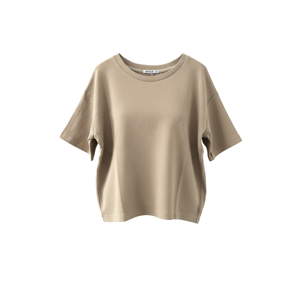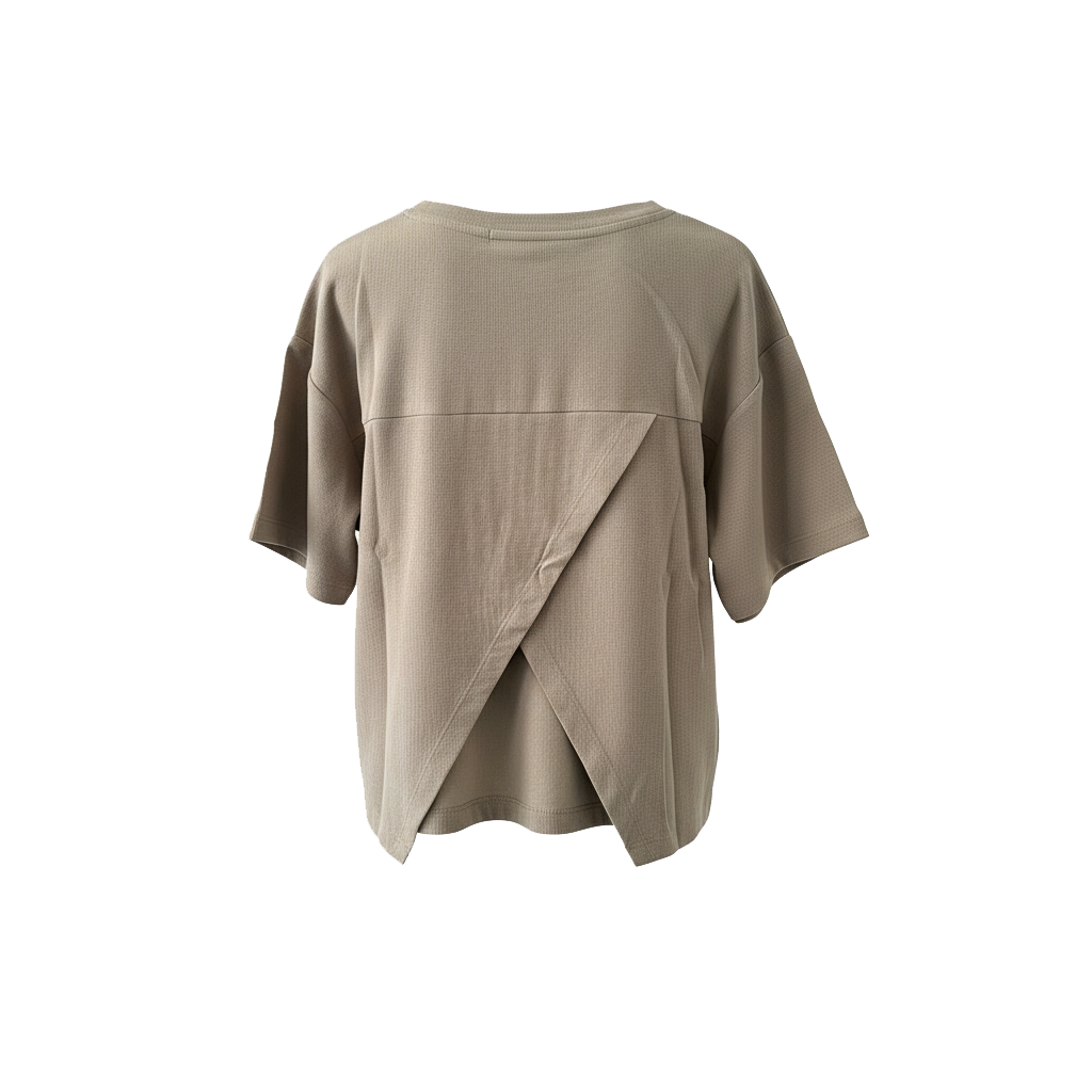 تیشرت ساده با یقه گرد از جنس تریکو بیسکوییتی، طراحی‌شده با برش‌های ضربدری و پشت باز برای جلوه‌ای متفاوت؛ با فرم معتدل و حلقه آستین افتاده، مناسب استایل‌های چهارفصل و استفاده روزمره.