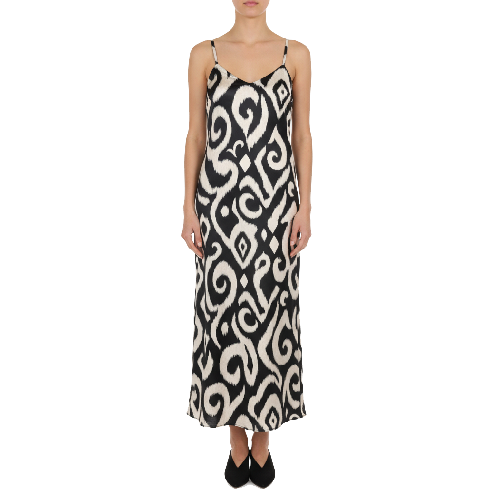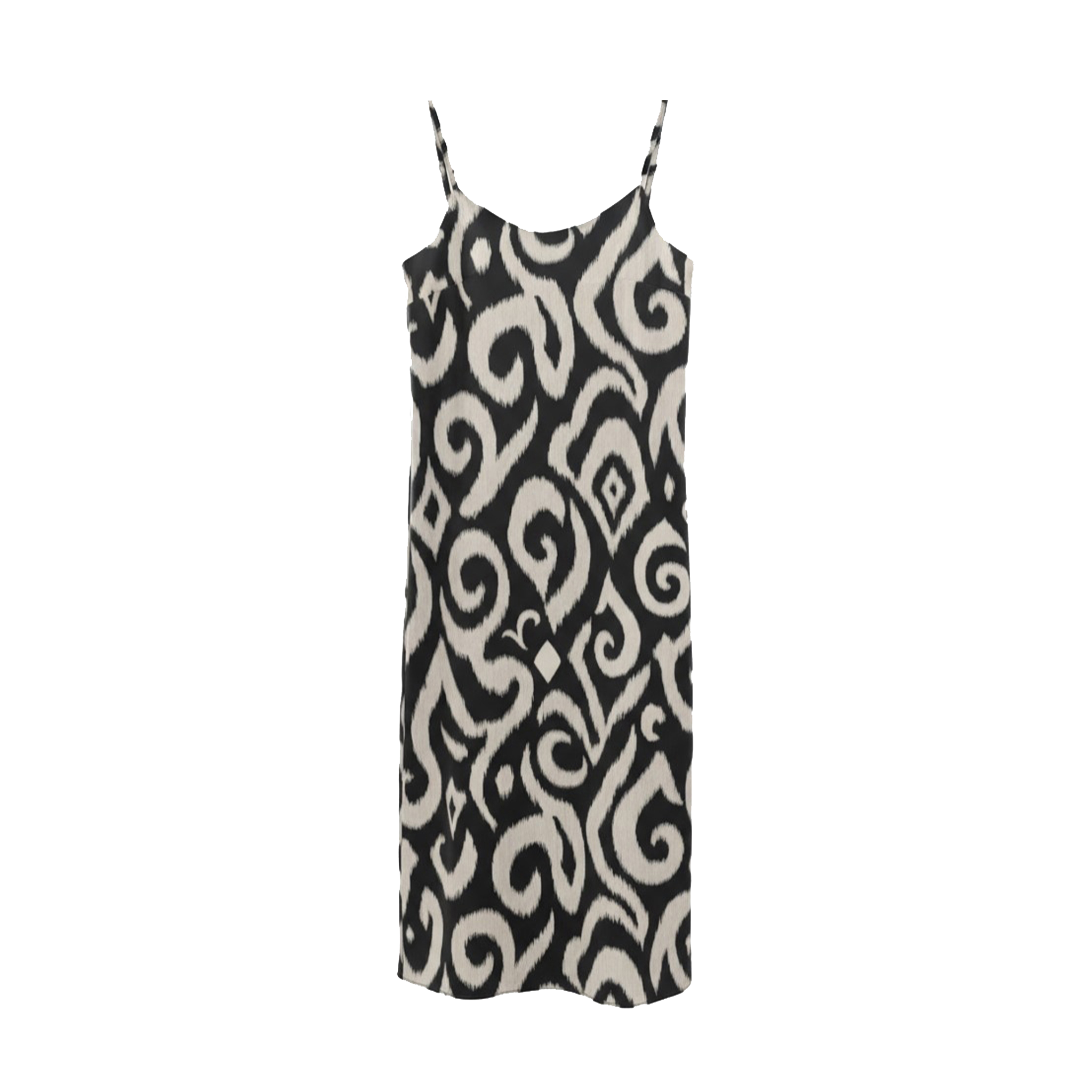 سارافون بندی بلند طرحدار از جنس ساتن سیلک با بافت لطیف و درخشش ملایم، انتخابی چشمنواز و ظریف برای مهمانیها و مراسم خاص؛ با ایستایی روان و جلوهای شیک و مجلسی.