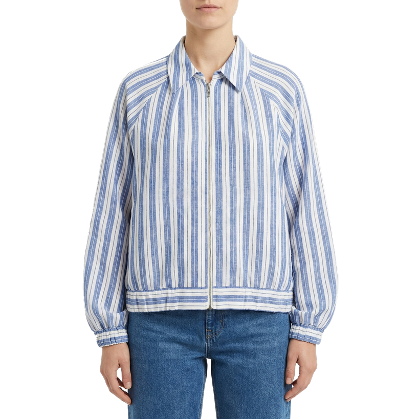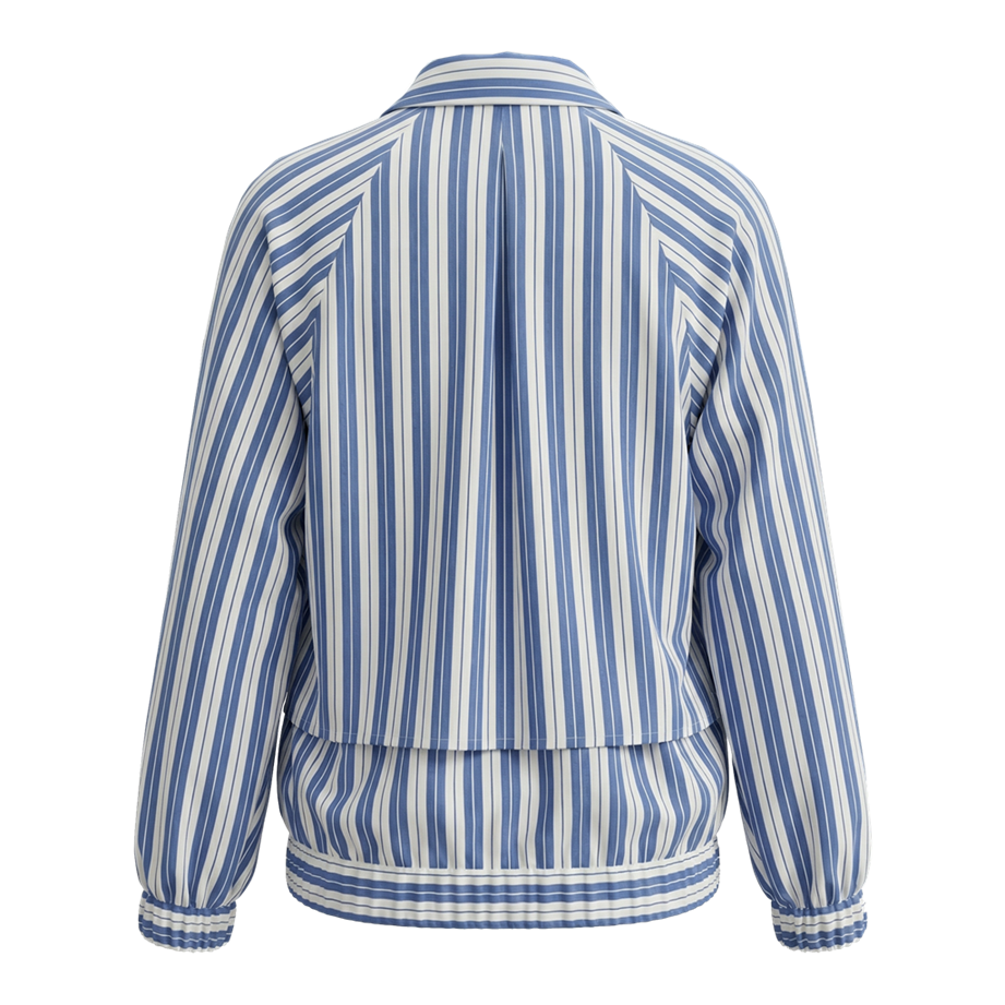 شومیز زیپدار از جنس لینن راهراه با کش در سرآستینها و پایین لباس، طراحیشده با فرم اسپرت و راحت؛ انتخابی خنک و کاربردی برای استایلهای روزمره.